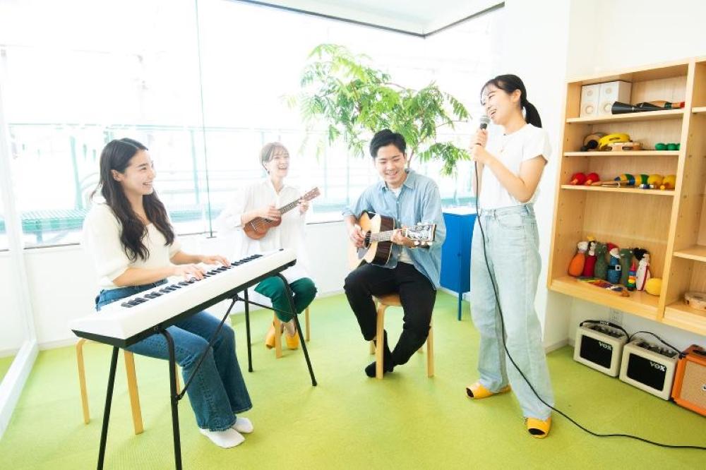 防音室を無料で利用できるほか、ギターなどの楽器も並行して学べたり、グループレッスンや発表会、交流会などのイベントも盛ん。